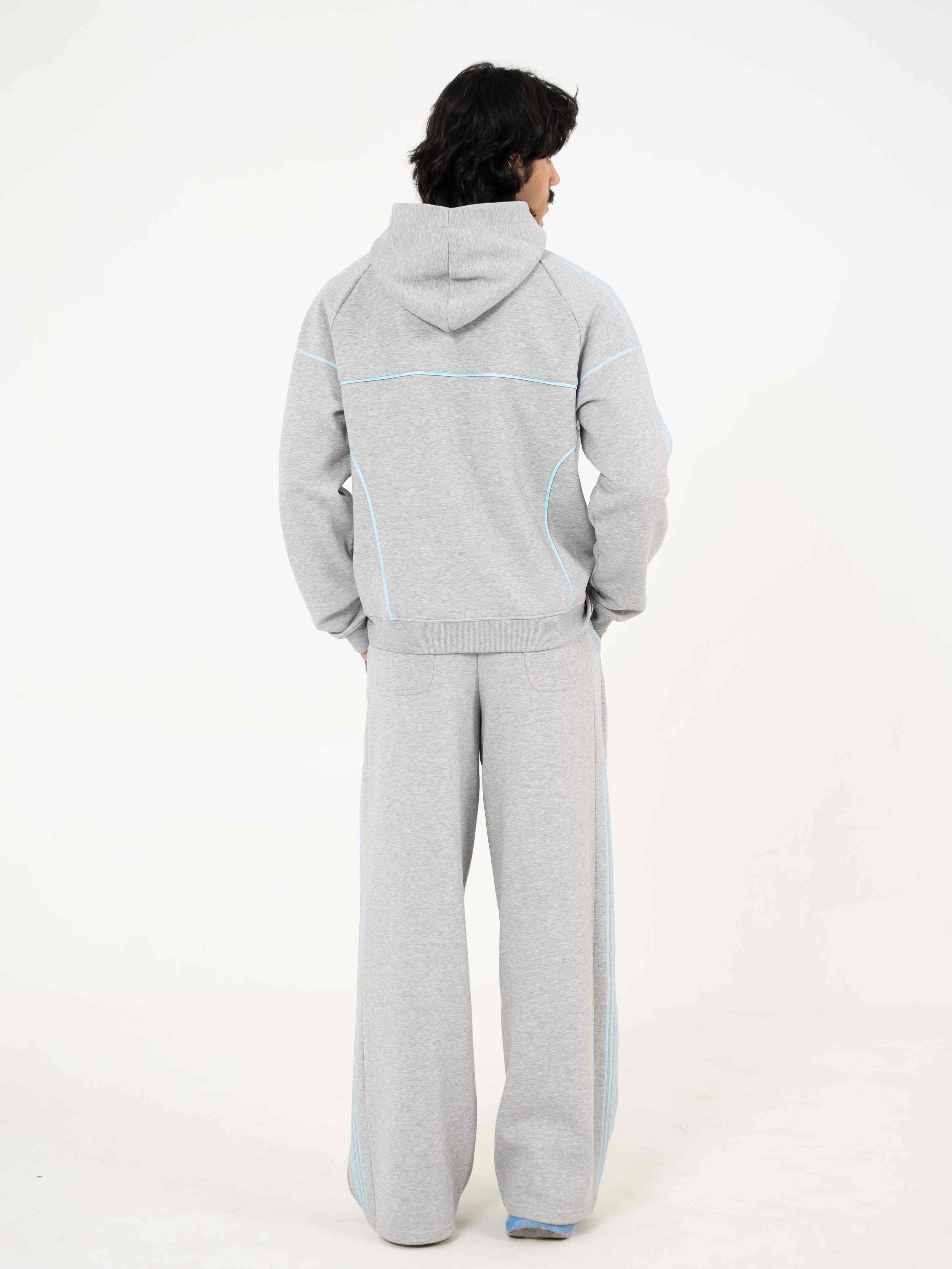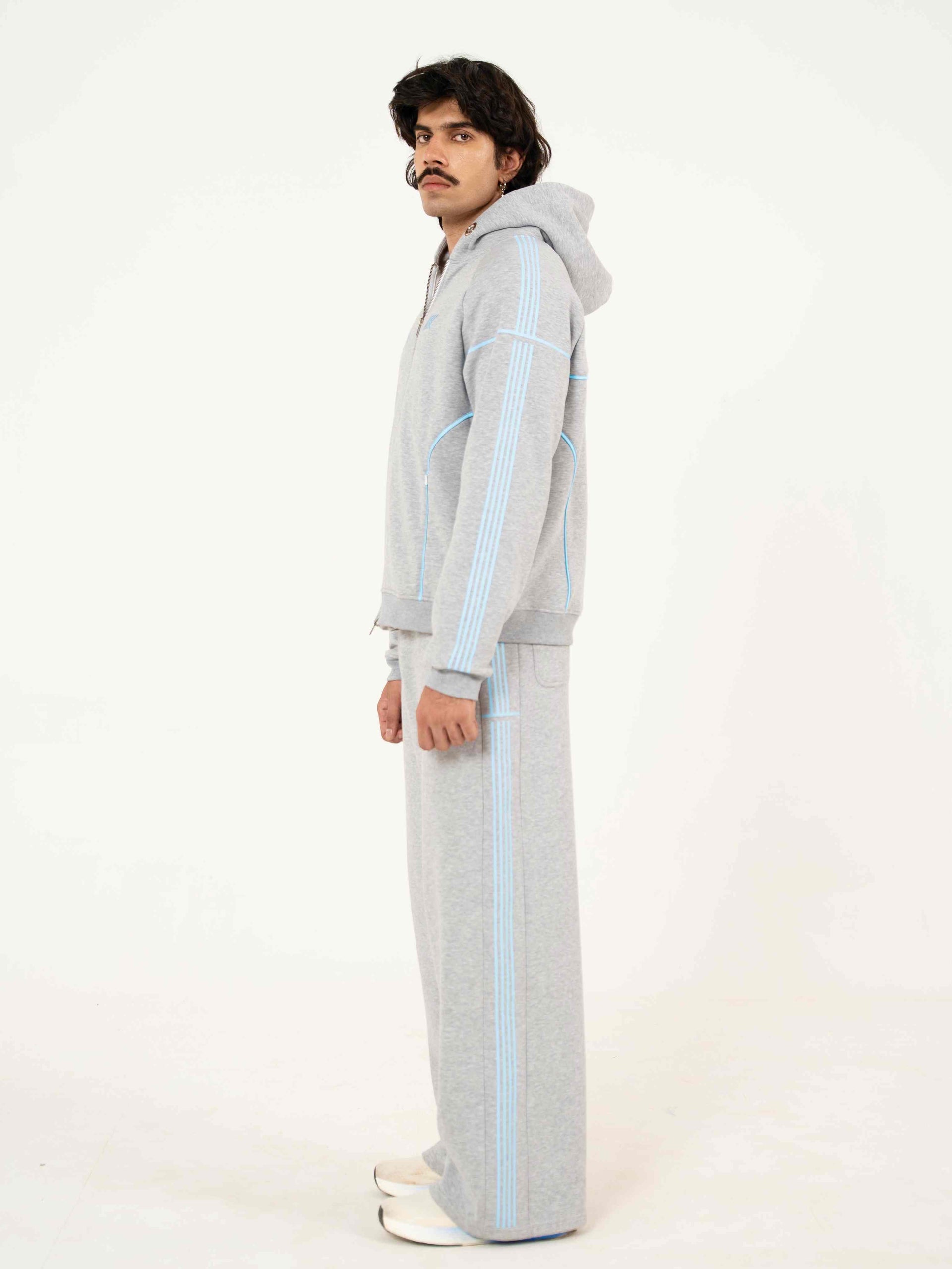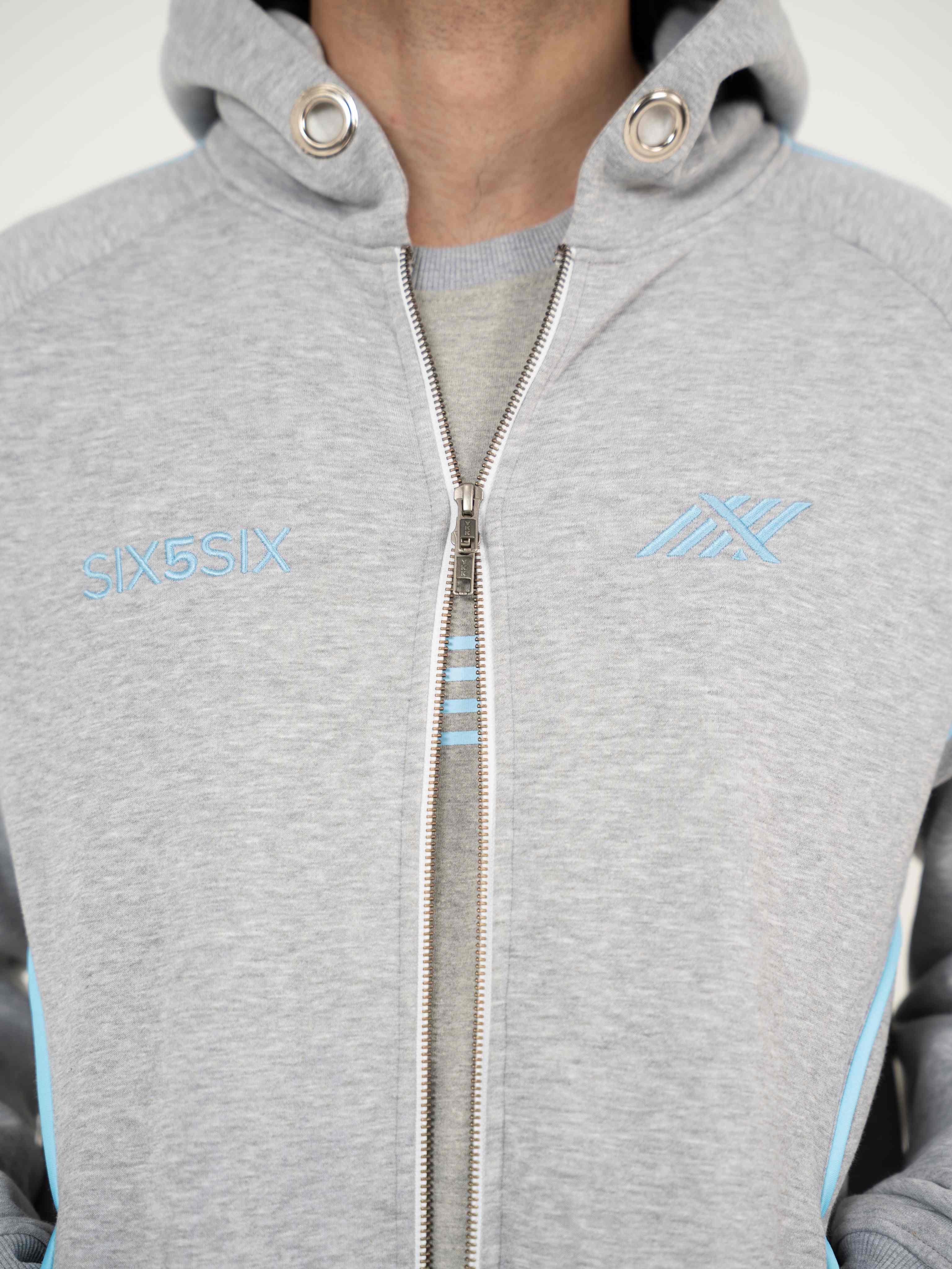 Designed as an everyday essential with premium detailing, the Touchstone Track jacket redefines simplicity through construction finesse. Crafted from 400 GSM brushed fleece, it’s built with a dual metal zip front and subtle ice blue piping that conceals functional spacious zip pockets along its curves.The chest carries a silk-embroidered SIX5SIX wordmark and monogram, while the sleeves extend the brand’s signature stripe identity, screen printed for a refined sport-casual appeal. A piped yoke panel runs across the back, tying the silhouette together with quiet precision.Finished with metal eyelets and a structured hood, it’s a zipped hoodie that balances comfort, design detail, and understated luxury. !