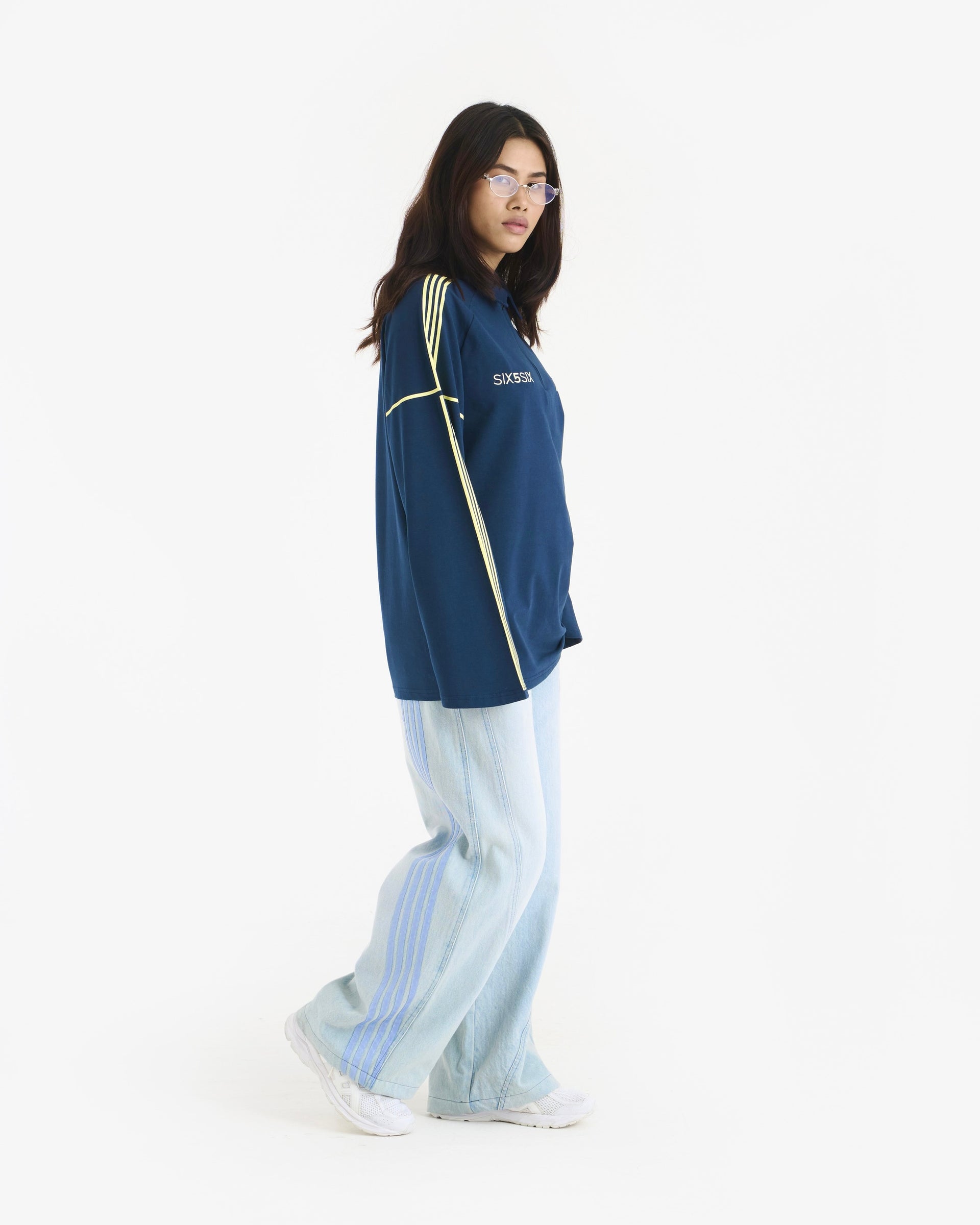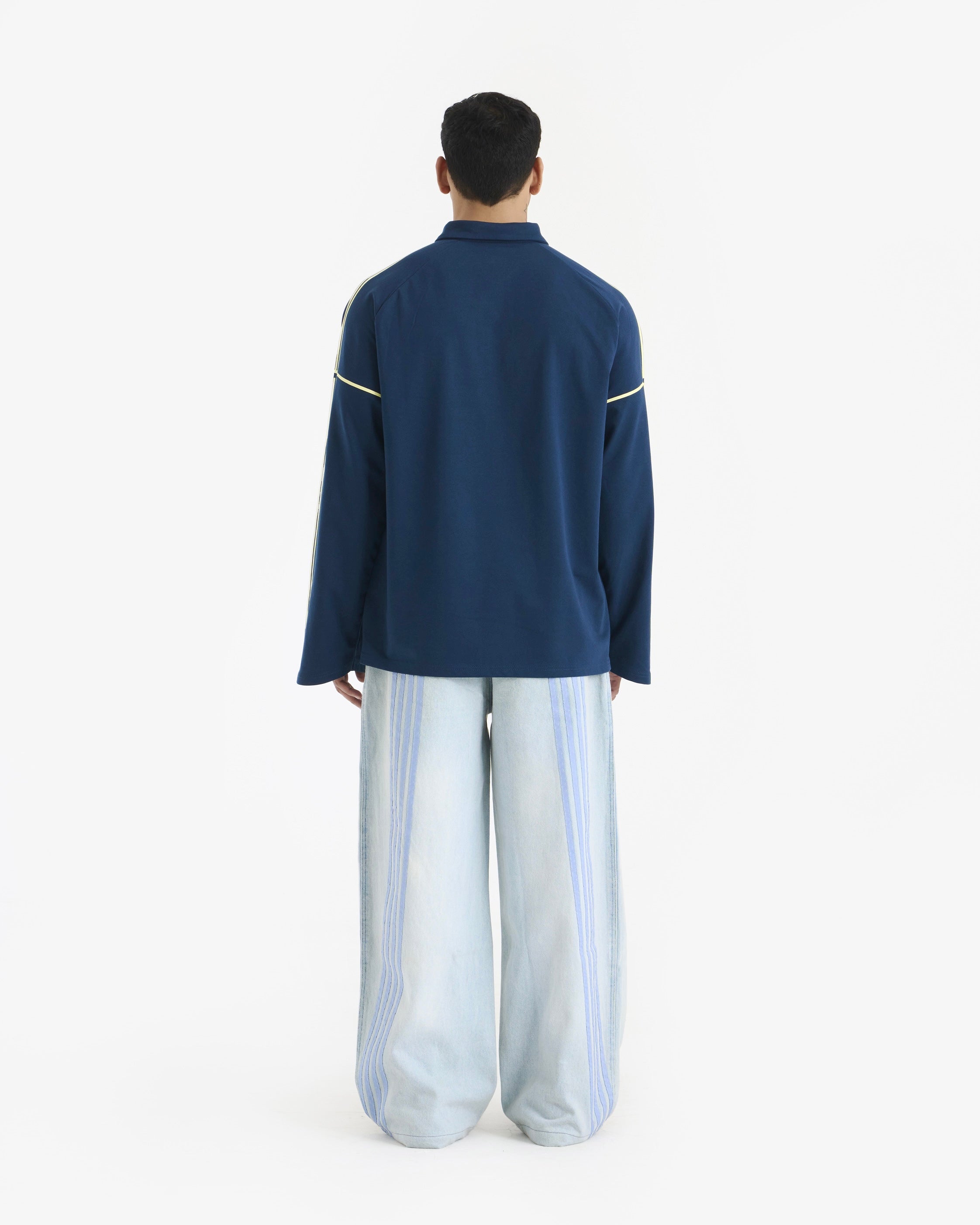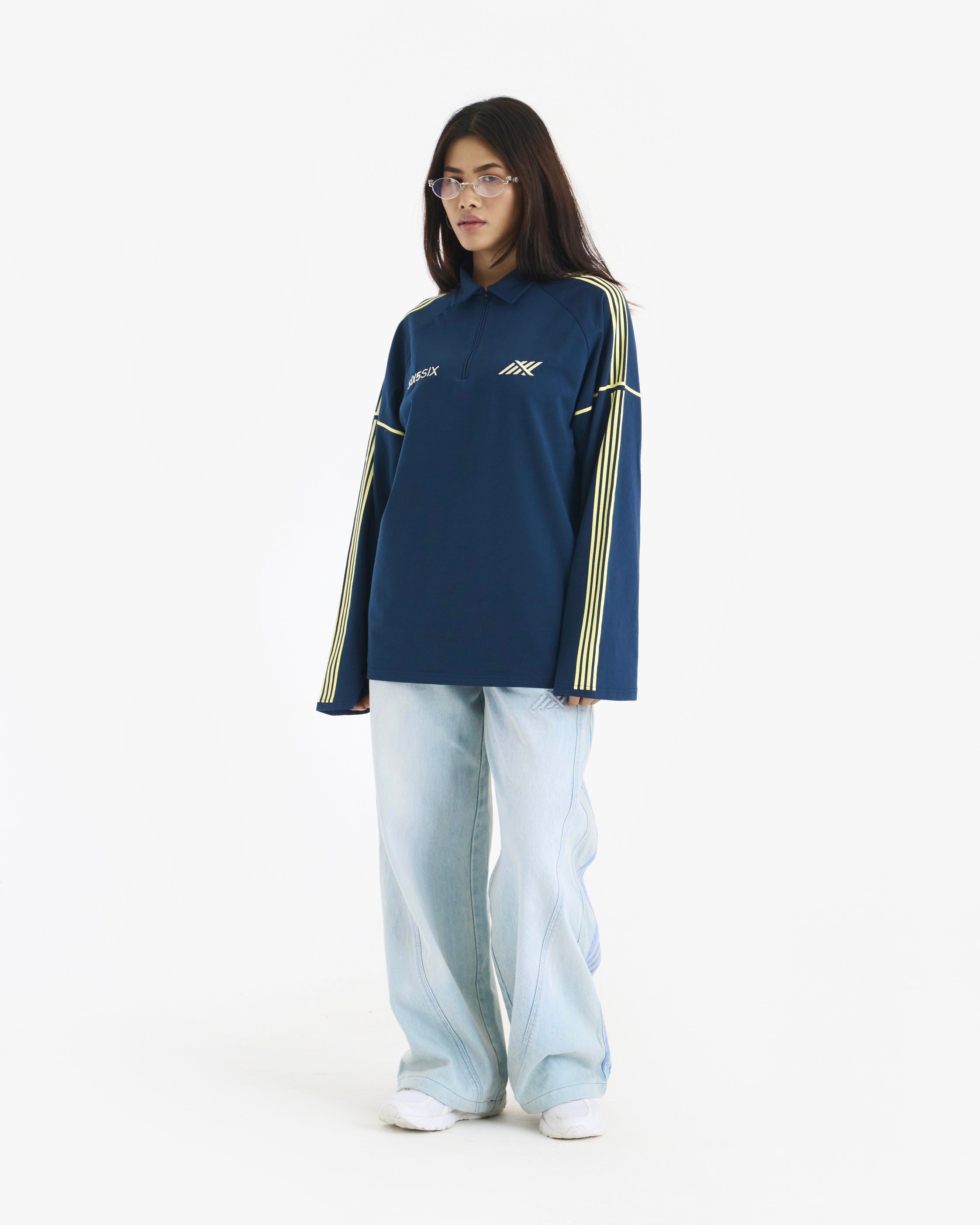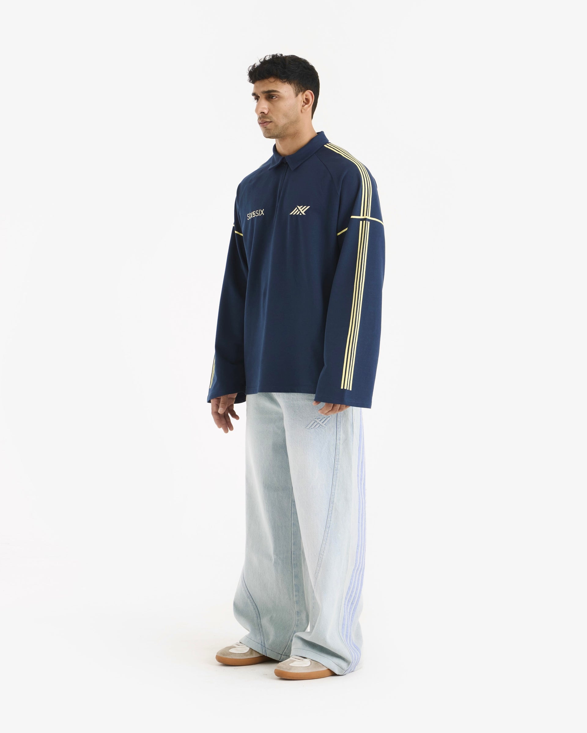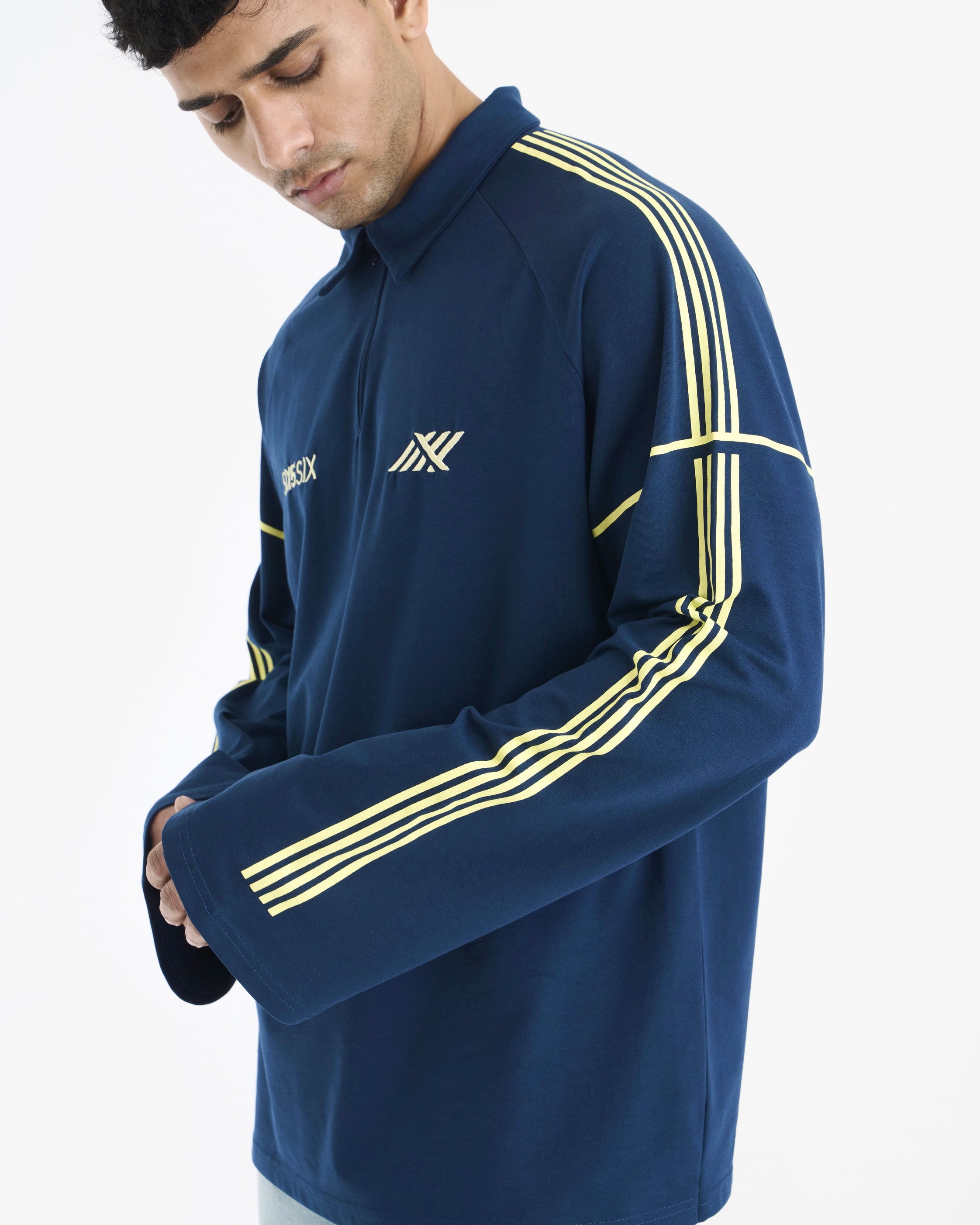A summer sport piece, crafted from breathable 240 GSM cotton terry for a comfortable yet elevated feel. The zip-up polo collar adds versatility, while the raglan sleeves with screen printed stripes extend directly from the SIX5SIX brand logo, creating a seamless visual flow. The embroidered brand name and logo adds on to the idea of a basic topwear offering from our brand, making this piece ideal for summer layering or an on-the-go look.