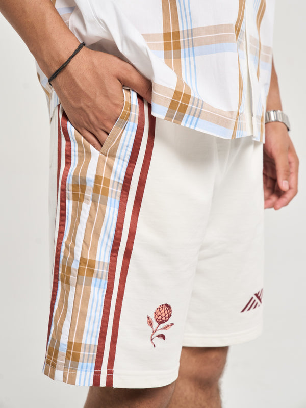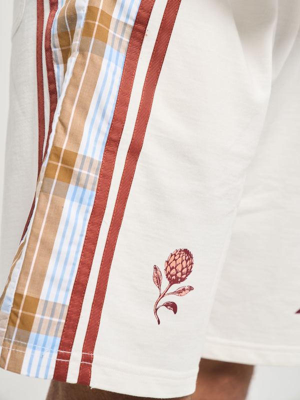 Relaxed terry shorts framed with rust poly-tape side stripes and a center insert of matching plaid. A Protea emblem and Six5Six monogram print sit across the front thighs like twin seals, while a back pocket adds utility. The mix of heritage plaid, postcard-style graphics, and sport binding elevates the shorts into a standalone resort piece or a perfect match with the shirt.